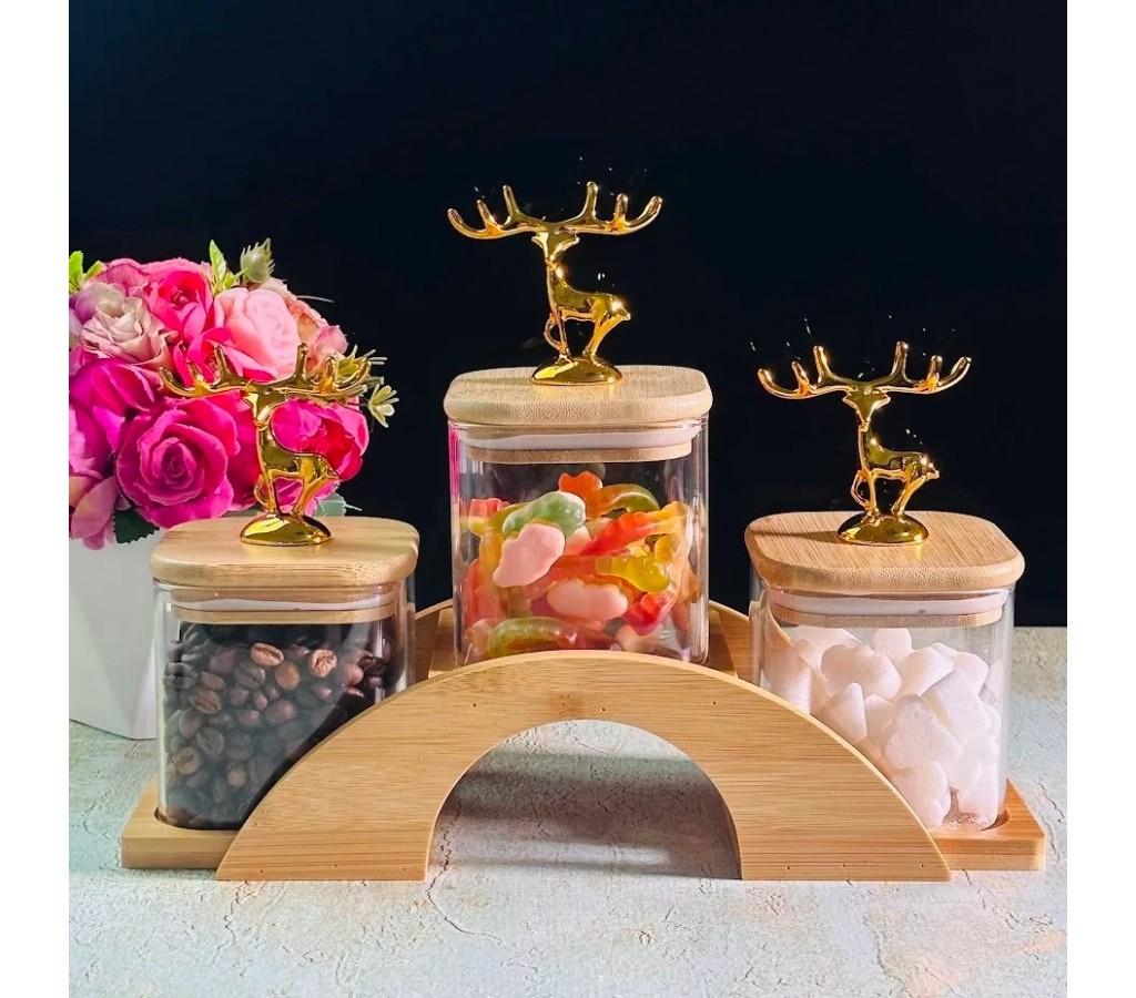 Набор из 3 банок 400 мл Yes Lenardi изготовлен из прочного, закаленного стекла. Крышка банки из натурального, экологически чистого природного бамбука, обеспечивает плотное прилегание к банке не пропуская воздух,что гарантирует сохранность продуктов. В комплект входит подставка из бамбука, на которую аккуратно ставятся банки. Размер банки 8х8х15 см, подставка 28х12х22 см