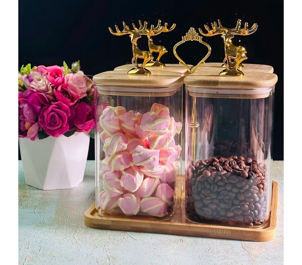 Набор из 4 банок 1300 мл Yes Lenardi изготовлен из прочного, закаленного стекла. Крышка банки из натурального, экологически чистого природного бамбука, обеспечивает плотное прилегание к банке не пропуская воздух,что гарантирует сохранность продуктов. В комплект входит подставка из бамбука, на которую аккуратно ставятся банки. Размер банки 16,5х10х10 см, подставка 22х22х24 см