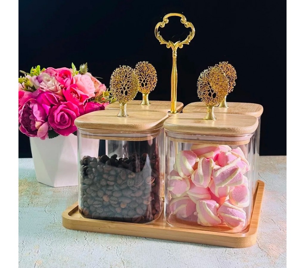 Набор из 4 банок 850 мл Yes Lenardi изготовлен из прочного, закаленного стекла. Крышка банки из натурального, экологически чистого природного бамбука, обеспечивает плотное прилегание к банке не пропуская воздух,что гарантирует сохранность продуктов. В комплект входит подставка из бамбука, на которую аккуратно ставятся банки. Размер банки 15х9,5х9,5 см, подставка 22,5х22,5х25 см