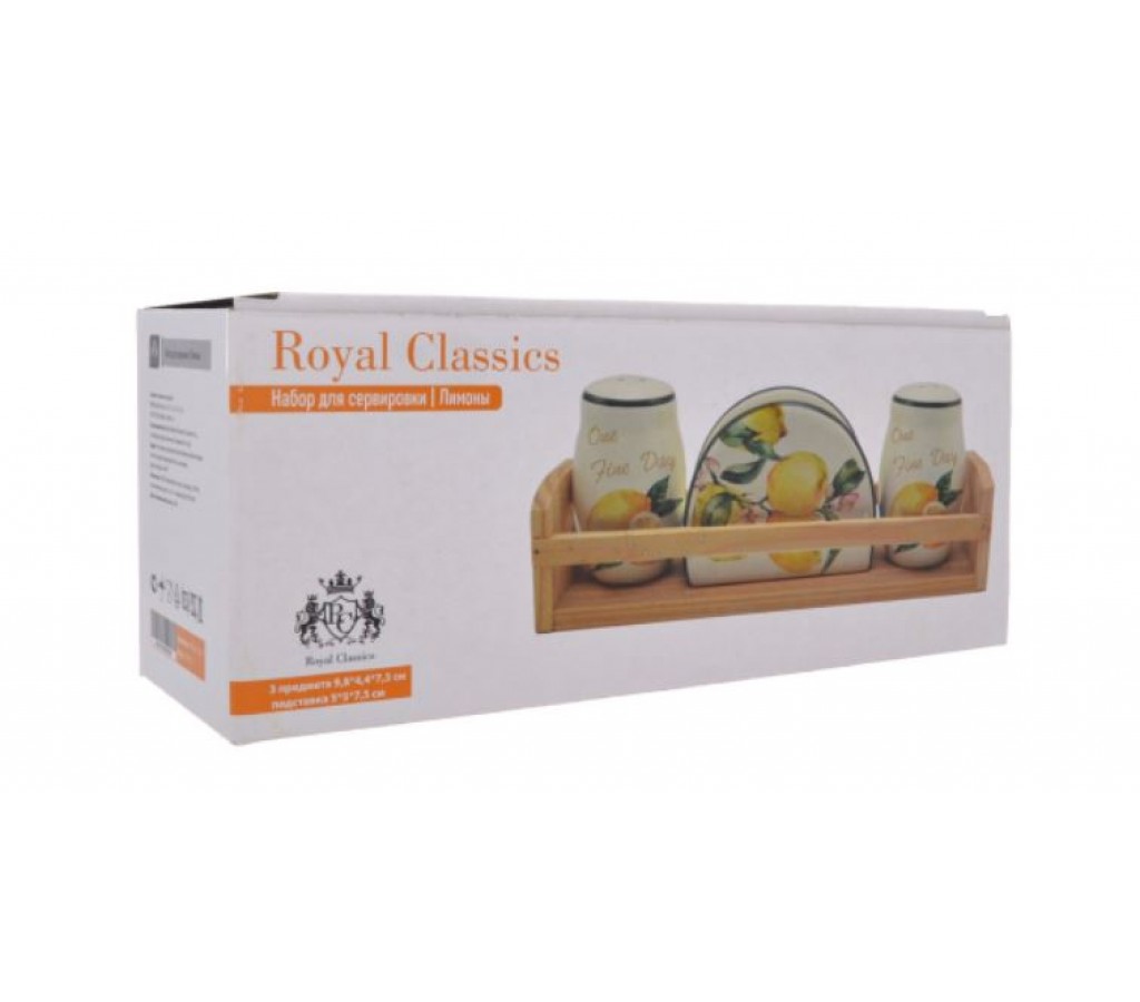 Набор для сервировки Лимоны Royal Classics 3 предмета 9,8*4,4*7,3 см подставка 5*5*7,5 см. Можно мыть в посудомоечной машине. Товар поставляется в подарочной упаковке.