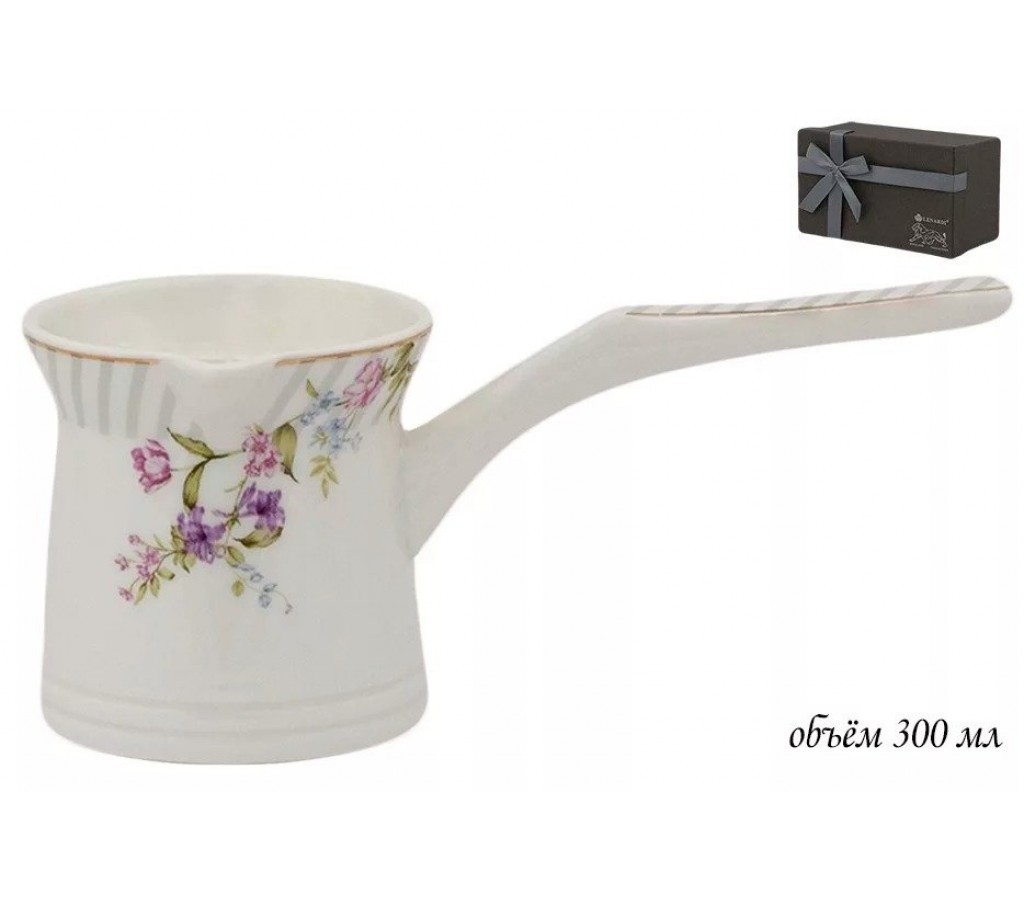 Турка 300 мл Lenardi из фарфора упакована в подарочную коробку. Не рекомендуется использовать в микроволновой печи и мыть в посудомоечной машине, по причине возможного повреждения золотого декоративного покрытия.