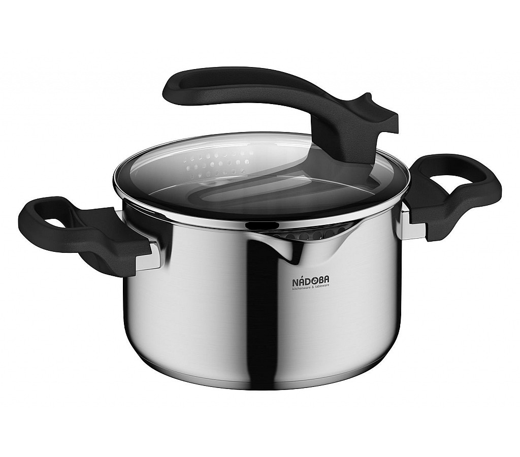 - Встроенный дуршлаг на крышках и носики на корпусе посуды делают процесс слива воды простым и легким. При этом для изготовления крышки использовалось термостойкое закалённое стекло.