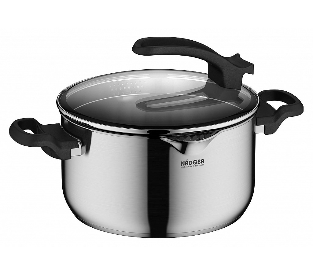 - Встроенный дуршлаг на крышках и носики на корпусе посуды делают процесс слива воды простым и легким. При этом для изготовления крышки использовалось термостойкое закалённое стекло.