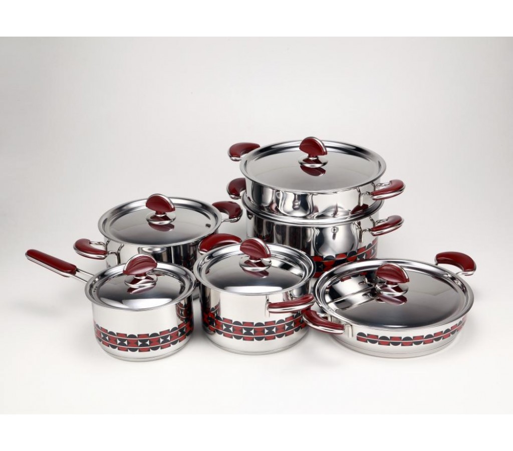 Посуда оснащена удобными металлическими ручками с пластиковыми вставками, которые не нагреваются в процессе приготовления пищи. Крышки изготовлены из нержавеющей стали с пластиковыми ручками. Крышки имеют отверстия для выпуска пара.