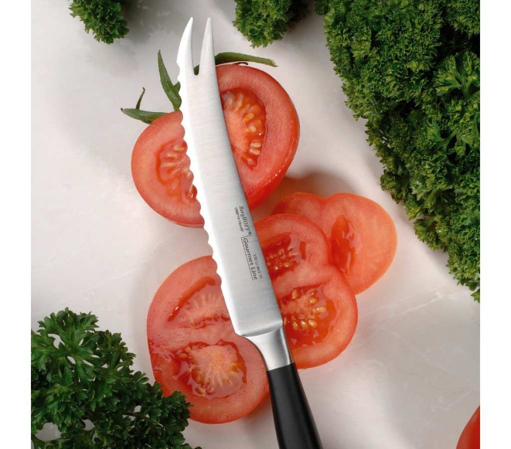 Нож для томатов имеет типичный закругленный наверх кончик, что упрощает сервировку. Зазубренное лезвие позволяет легко разрезать томатную кожицу. Высококачественные инструменты, долго сохраняющие остроту и простые в уходе. Ножи, изготовлены из единого куска твердой высокоуглеродистой стали, пятно и коррозиеустойчивые. Тяжелая кованая шейка обеспечивает идеальный баланс и безопасность для рук. Ручка, разработанная для безопасного захвата, изготовлена из синтетического материала, известного своей твердостью и прочностью. Заточены вручную.