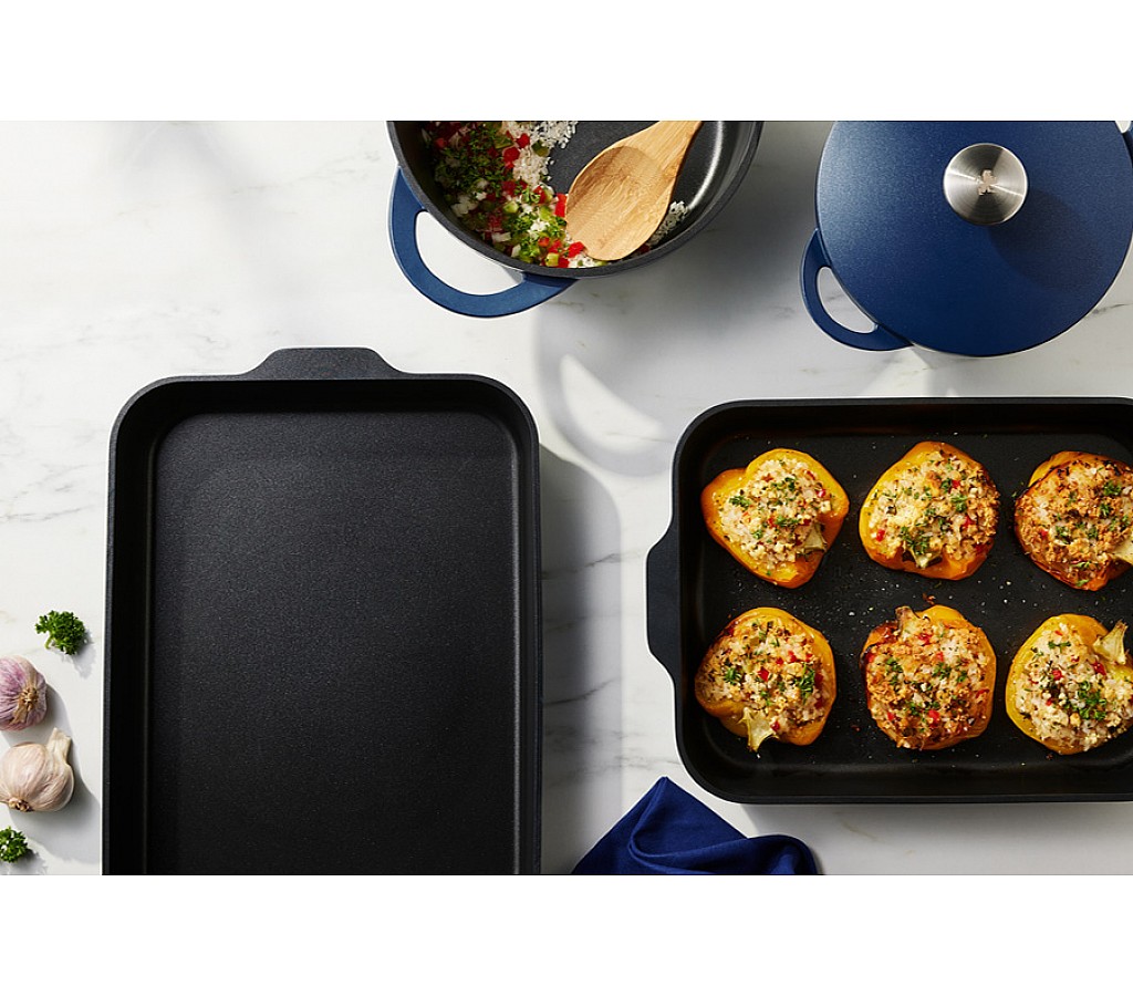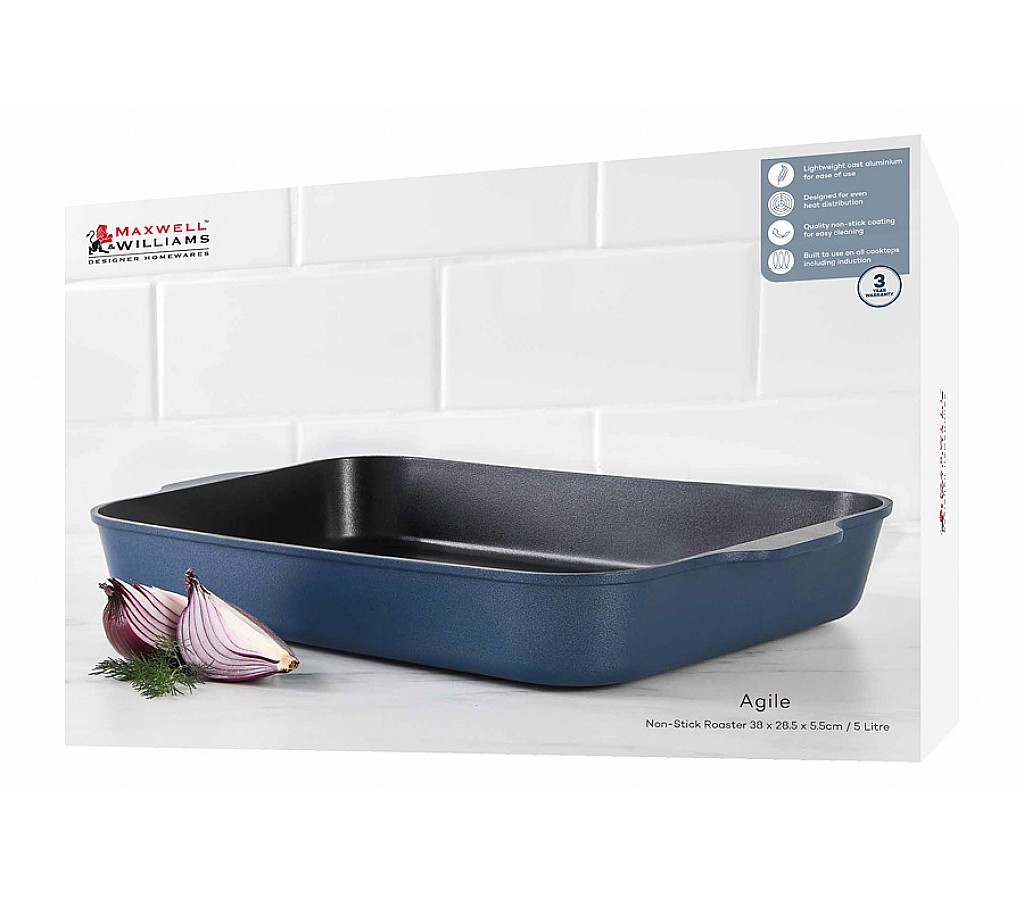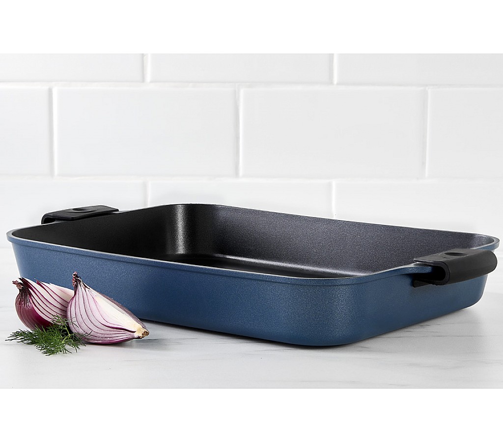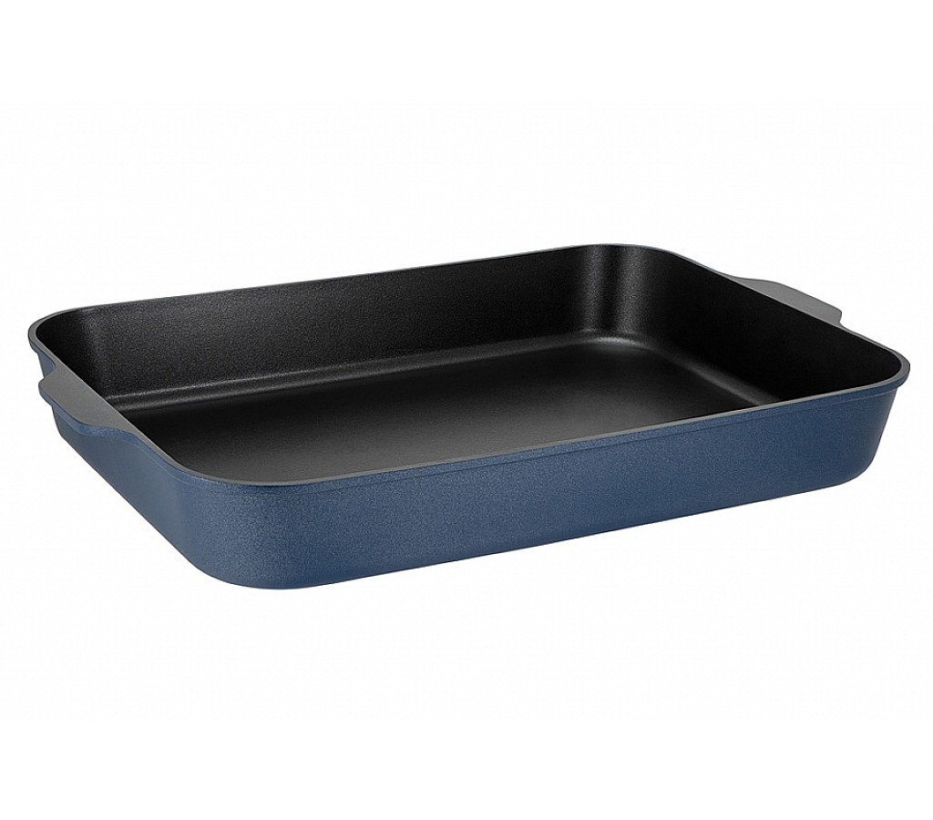 Форма для запекания Agile, синяя, 38x28,5x5,5 см. Форма для запекания из литого алюминия с антипригарным покрытием. Для всех типов плит, включая индукционные. Можно мыть в ПММ. Использовать в духовке до 210 градусов