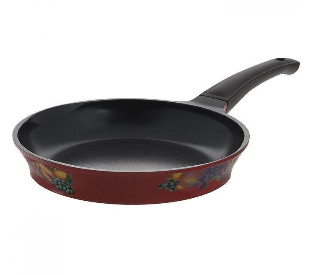 Внешняя поверхность красного цвета оформлена красочным изображением фруктов. Удобная ручка, изготовленная из бакелита, не нагревается в процессе готовки и обеспечивает комфортное использование. Подходит для газовых, электрических, керамических, галогенных плит. Не рекомендуется мыть в посудомоечной машине.