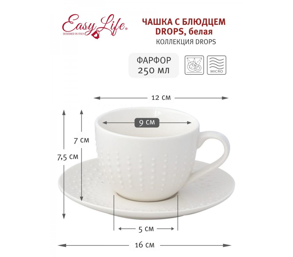 Чашка с блюдцем Drops белая Easy Life 0,25 литра без упаковки. Мыть теплой водой с применением ЖМС. Можно использовать в СВЧ и посудомоечной машине.