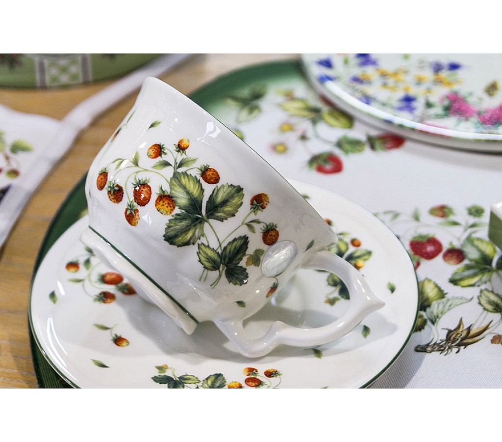 Чашка с блюдцем Земляника Carmani 340 мл. Подарочная упаковка. Мыть мягкими моющими средствами. Можно использовать в СВЧ и в посудомоечной машине.