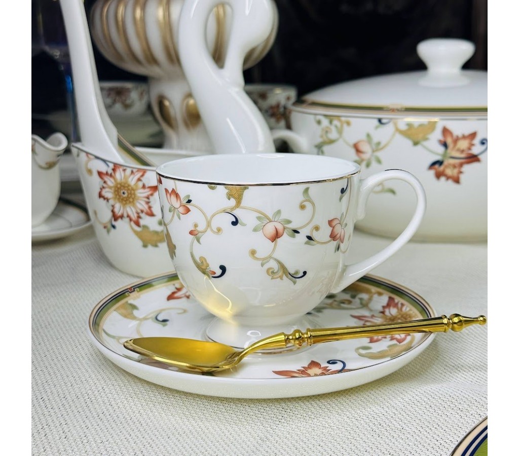 Чайный набор Кассиопея на 6 персон 28 предметов изготовлен из тончайшего костяного фарфора. Посуду отличет изысканный цветочный декор в сочетании с золотой отводкой. Легкий, прочный и долговечный фарфор. Упакован в подарочную коробку.
