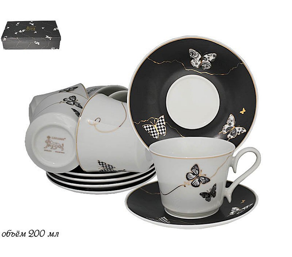 Чайный набор Lenardi Butterfly черный на 6 персон 12 предметов. Упакован в подарочную коробку. Не рекомендуется использовать в микроволновой печи и мыть в посудомоечной машине, по причине возможного повреждения золотого декоративного покрытия.
