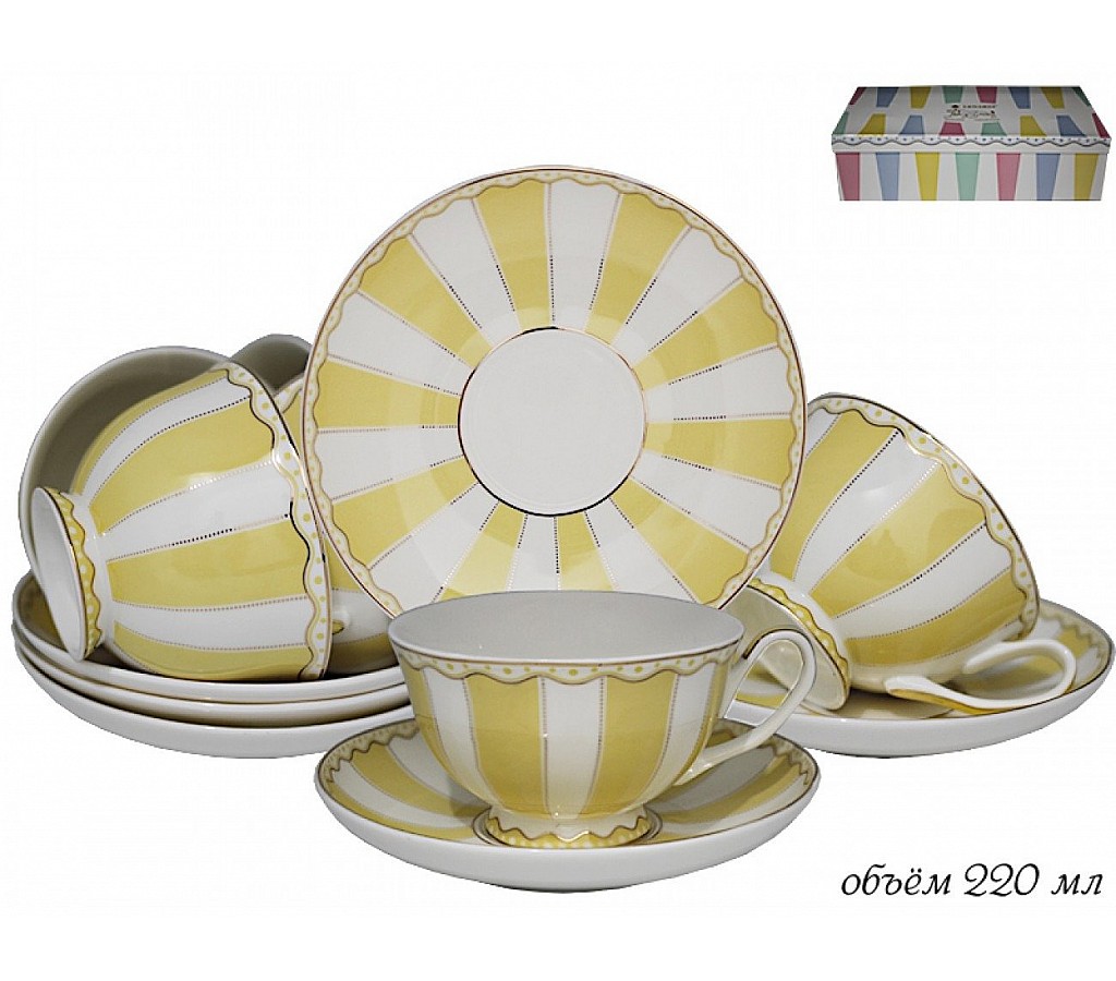Чайный набор Lenardi Шатер желтый на 6 персон 12 предметов. Упакован в подарочную коробку. Не рекомендуется использовать в микроволновой печи и мыть в посудомоечной машине, по причине возможного повреждения декоративного покрытия.