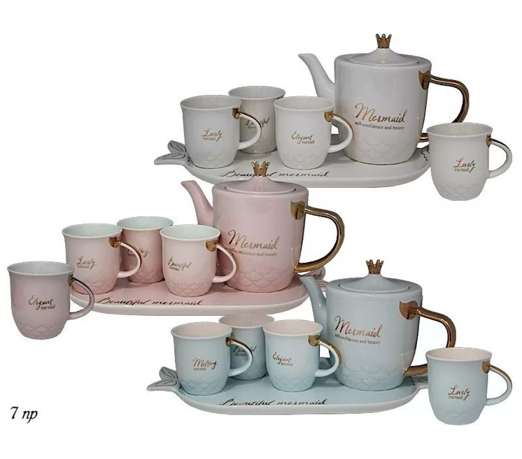 Чайный набор Lenardi Mermaid голубой на 4 персоны 6 предметов упакован в подарочную коробку.Фарфоровый набор для чая на 4 персоны выполнен в морском стиле. Поднос в виде рыбки, чашки и чайник с чешуйками и хвостиком на ручке. Крышка чайника украшена золотой короной. Состав: