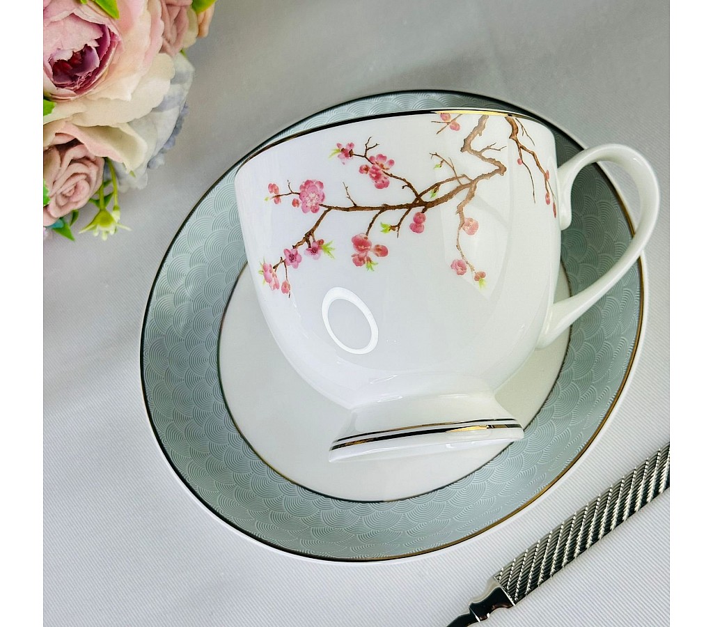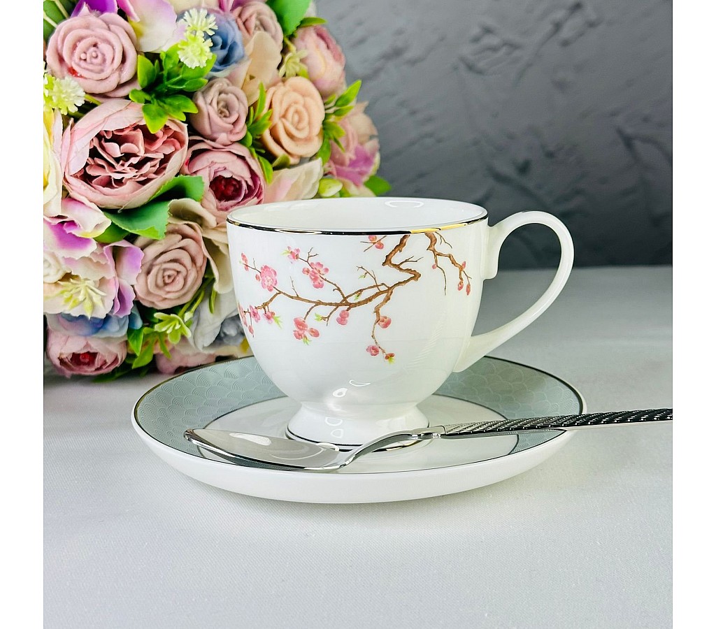 Чайный набор Сакура на 6 персон 12 предметов изготовлен из тончайшего костяного фарфора.Чашки и блюдца декорированы весенним декором японской сакуры. Традиционный праздник «ханами» имеет для японцев глубокий смысл – короткое цветение сакуры и опадение её лепестков является для них метафорой самой жизни, её быстротечности и красоты. Упакован в подарочную коробку.