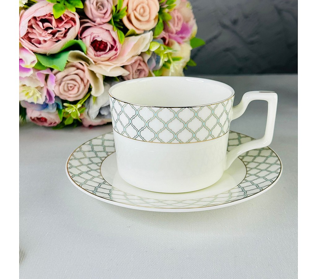 Чайный набор Версаль на 6 персон 12 предметов изготовлен из тончайшего костяного фарфора.Набор декорирован бирюзовым цветом с красивым орнаментом, что придает ему королевский шик и утонченную элегантность. Упакован в подарочную коробку.