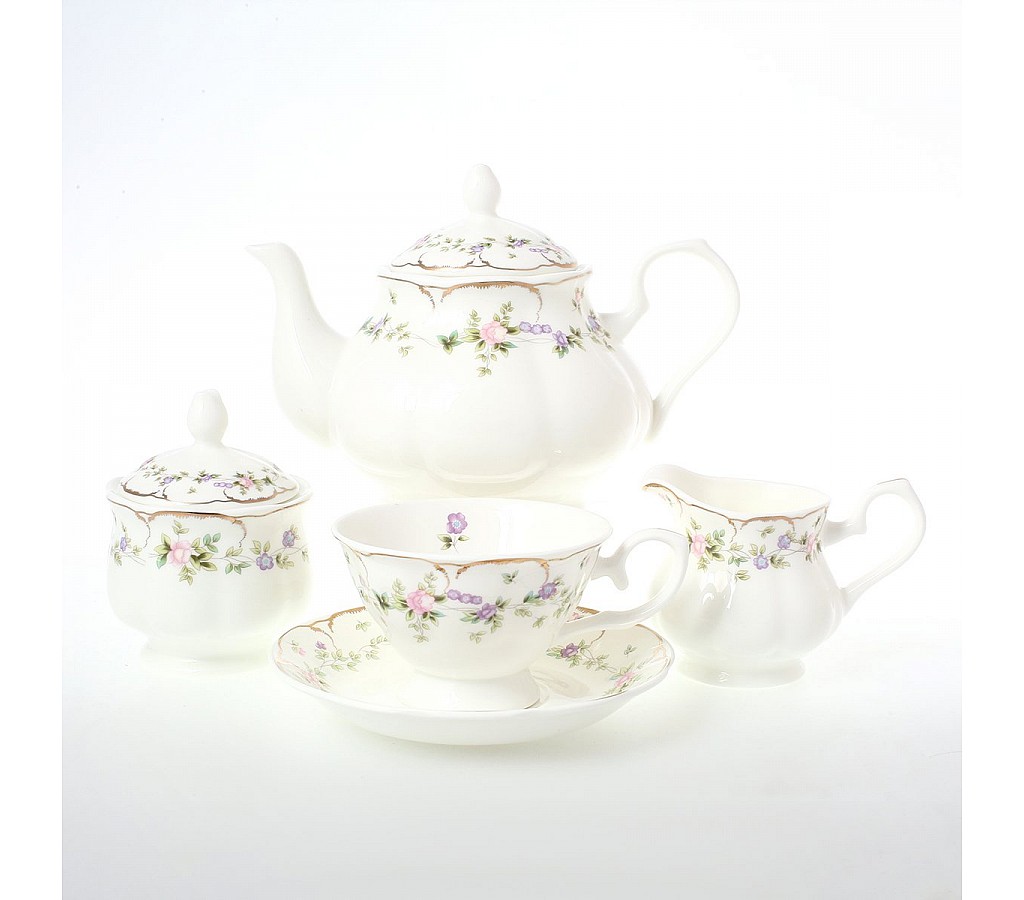 Чайный набор воспоминание это то что нужно для создания теплых приятных моментов. Сервиз выполнен из тонкого фарфора и декорирован нежным цветочным рисунком с золотом. Если вы любите классику или являетесь поклонником стиля Прованс - этот сервиз для вас. Сервиз состоит из набора чайных пар на 6 персон, причем чашки большого размера - 250мл., чайника, сахарницы и молочника. Чашка имеет изящную форму и очень удобную ручку.