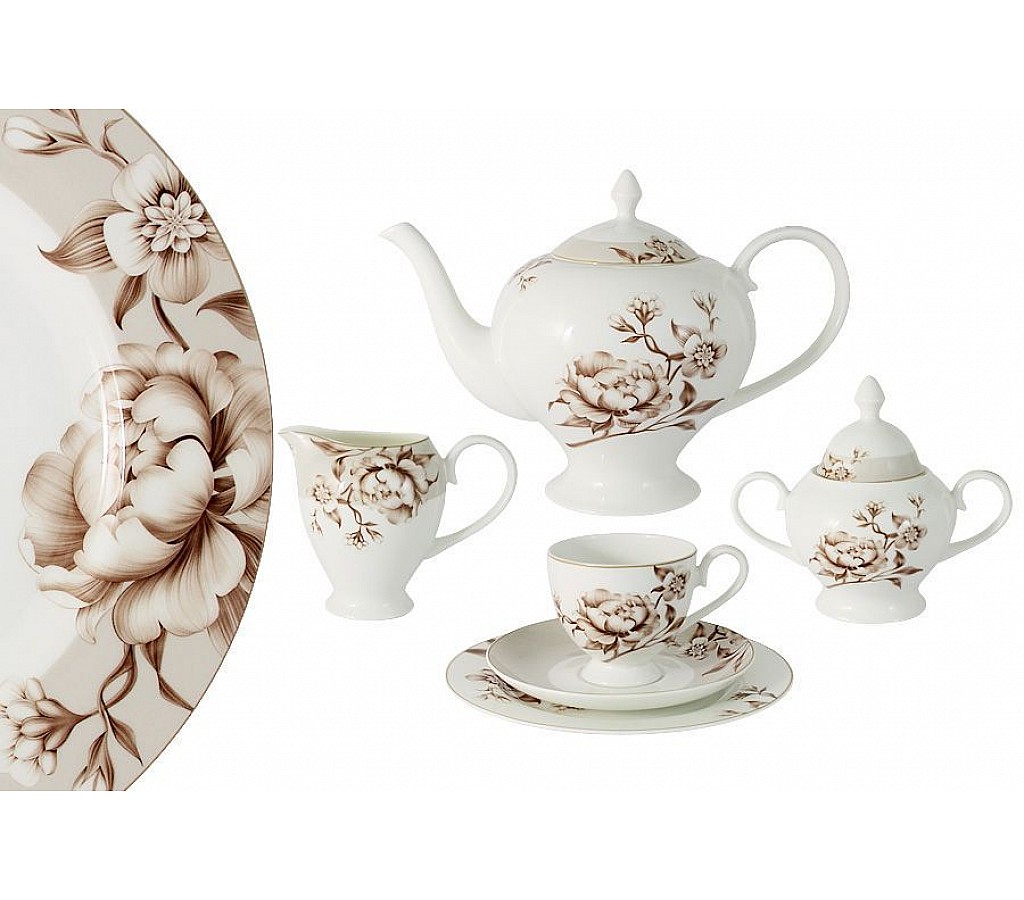 Чайный сервиз Стефания Emily на 6 персон 21 предмет: 6 чашек 0,2л, 6 блюдец, 6 тарелок 21см, чайник1,4л, сахарница 0,35л, молочник 0,35л