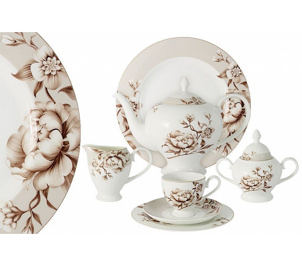 Чайный сервиз 40 предметов на 12 персон Стефания 12 чашек 0,2л, 12 блюдец, 12 тарелок 21см, чайник1,4л, сахарница 0,35л, молочник 0,35л, блюдо д/торта 28см