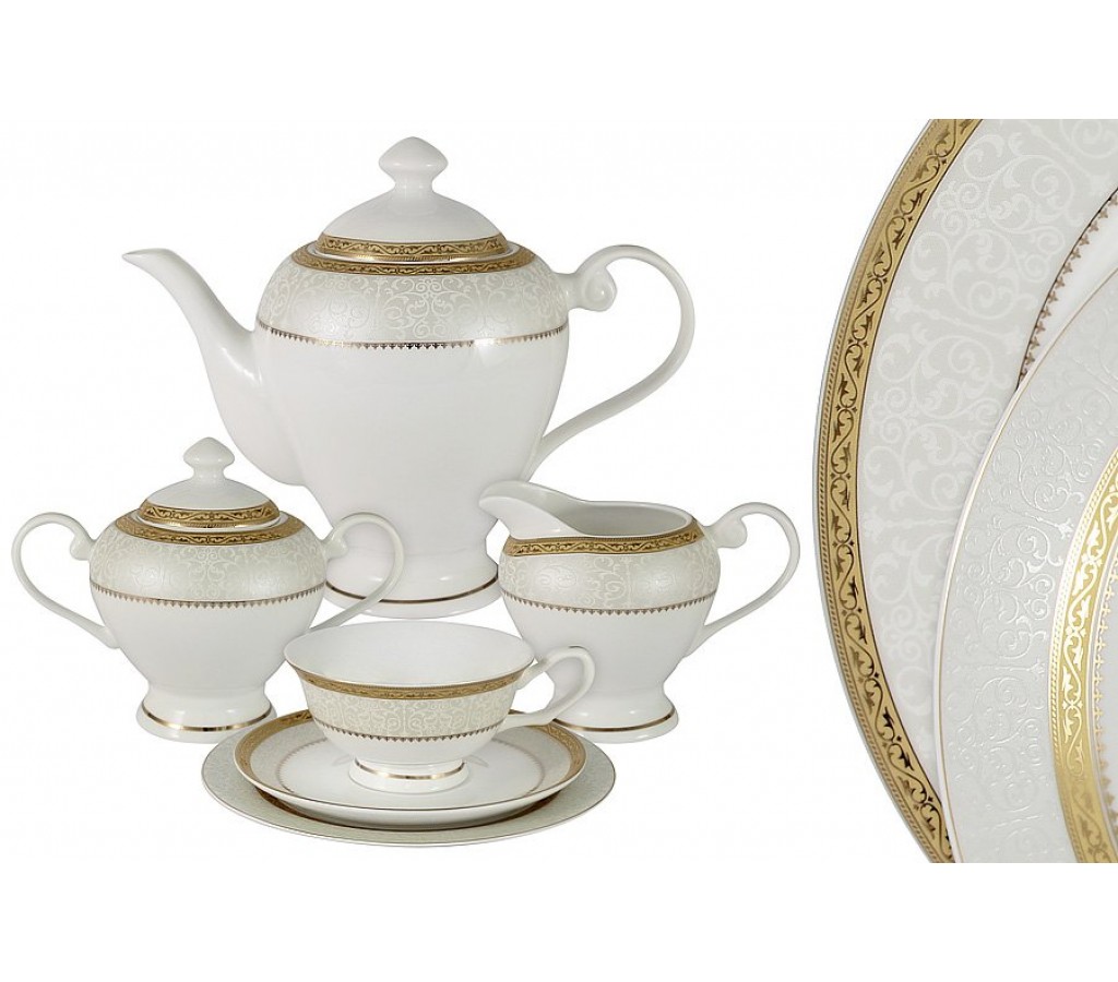 Чайный сервиз Бостон Голд 21 предмет на 6 персон 6 чашек 0.2л , 6 блюдец, 6 тарелок 19см , чайник 1.2л , сахарница 0.35л , молочник 0.35л Подарочная упаковка