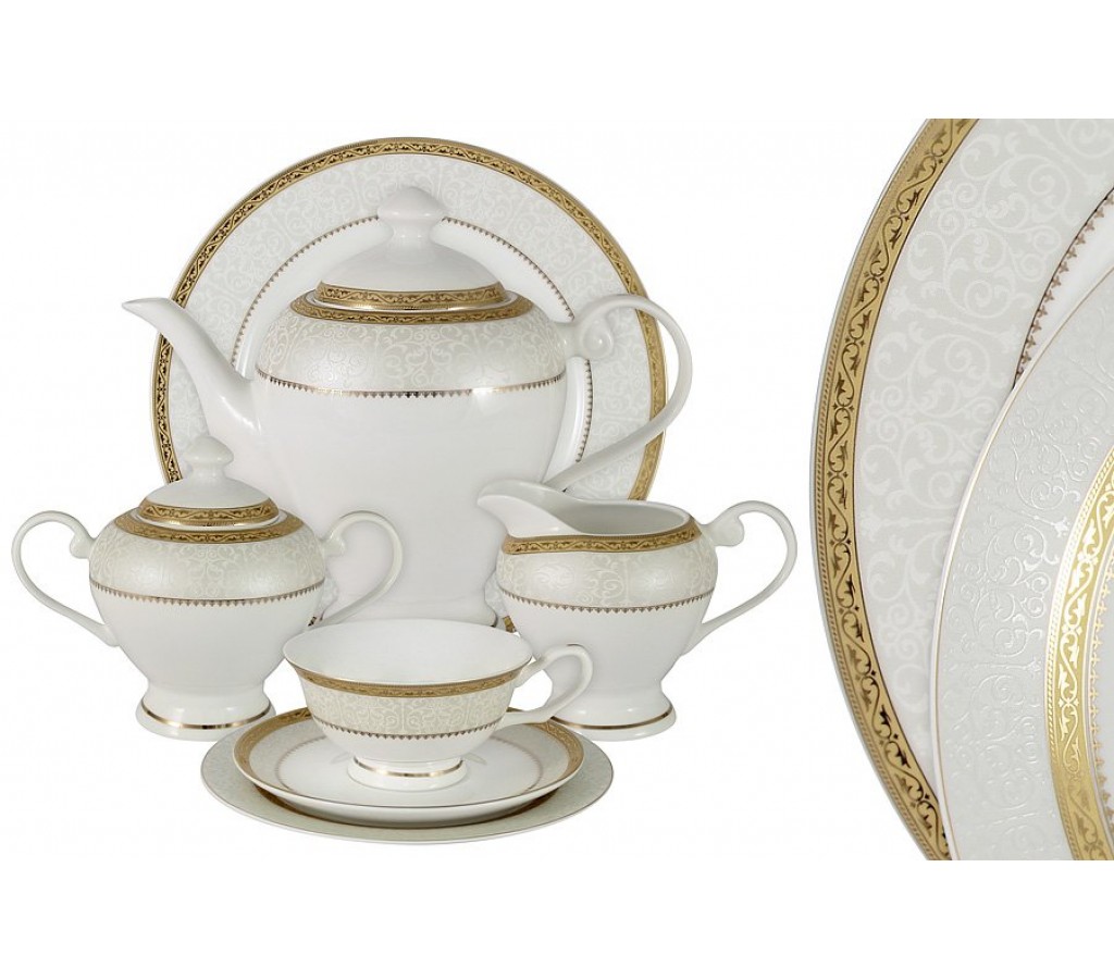 Чайный сервиз Бостон Голд 40 предметов на 12 персон 12 чашек 0.2л, 12 блюдец, 12 тарелок 19см, чайник 1.2л, сахарница 0.35л, молочник 0.35л , блюдо для торта 31см Обычная упаковка