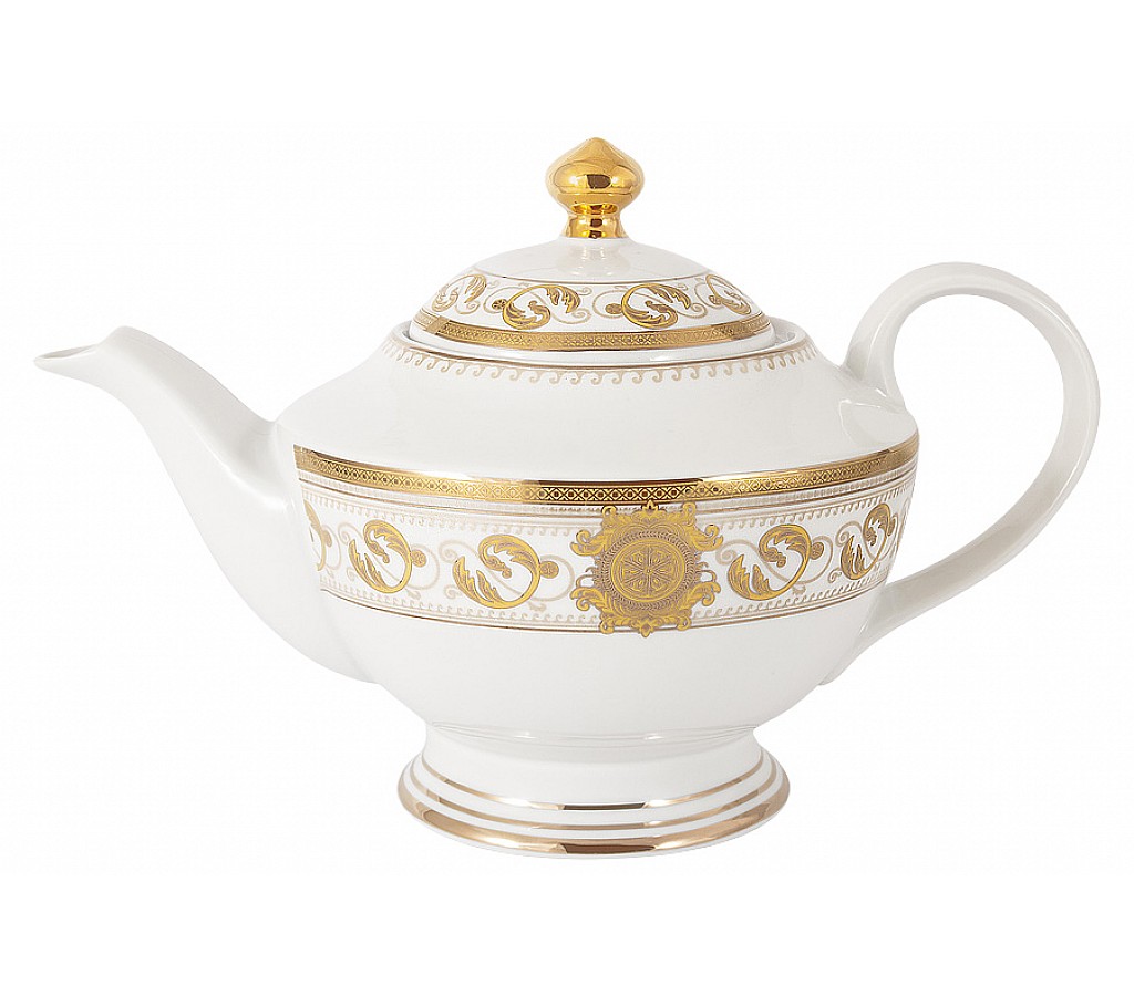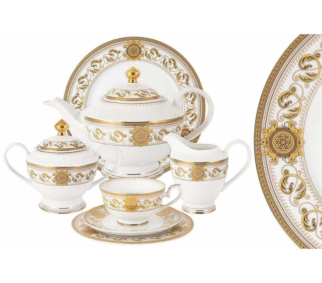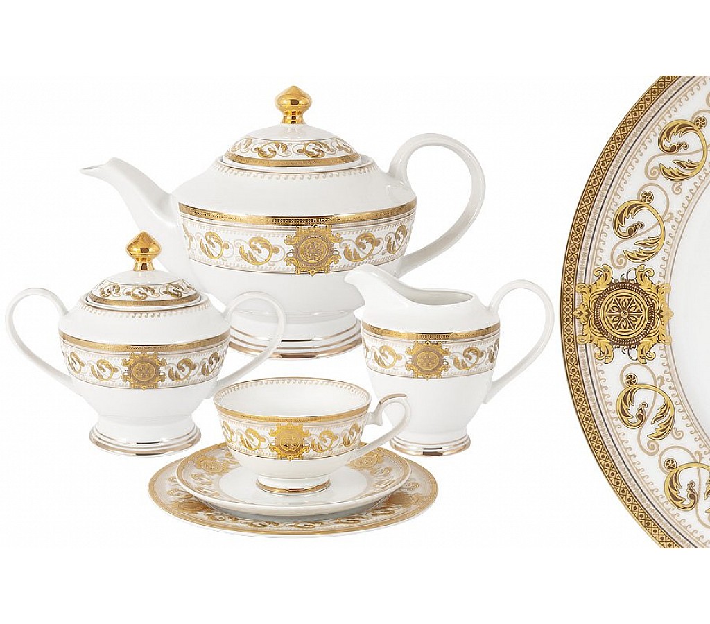 Чайный сервиз Эрмитаж Midori выполнен из белого фарфора с золотым декором. Он состоит из 23 предметов, сюда включены делертные тарелки, и расчитан на 6 персон. Размер: 6 чашек 0,2л., 6 блюдец, 6 тарелок 19см, чайник с крышкой 1,35л., сахарница с крышкой 0,35л., молочник 0,3л. Обычная упаковка. Сервиз не рекомендуется мыть в посудомоечной машине. Также не стоит его использовать в СВЧ.