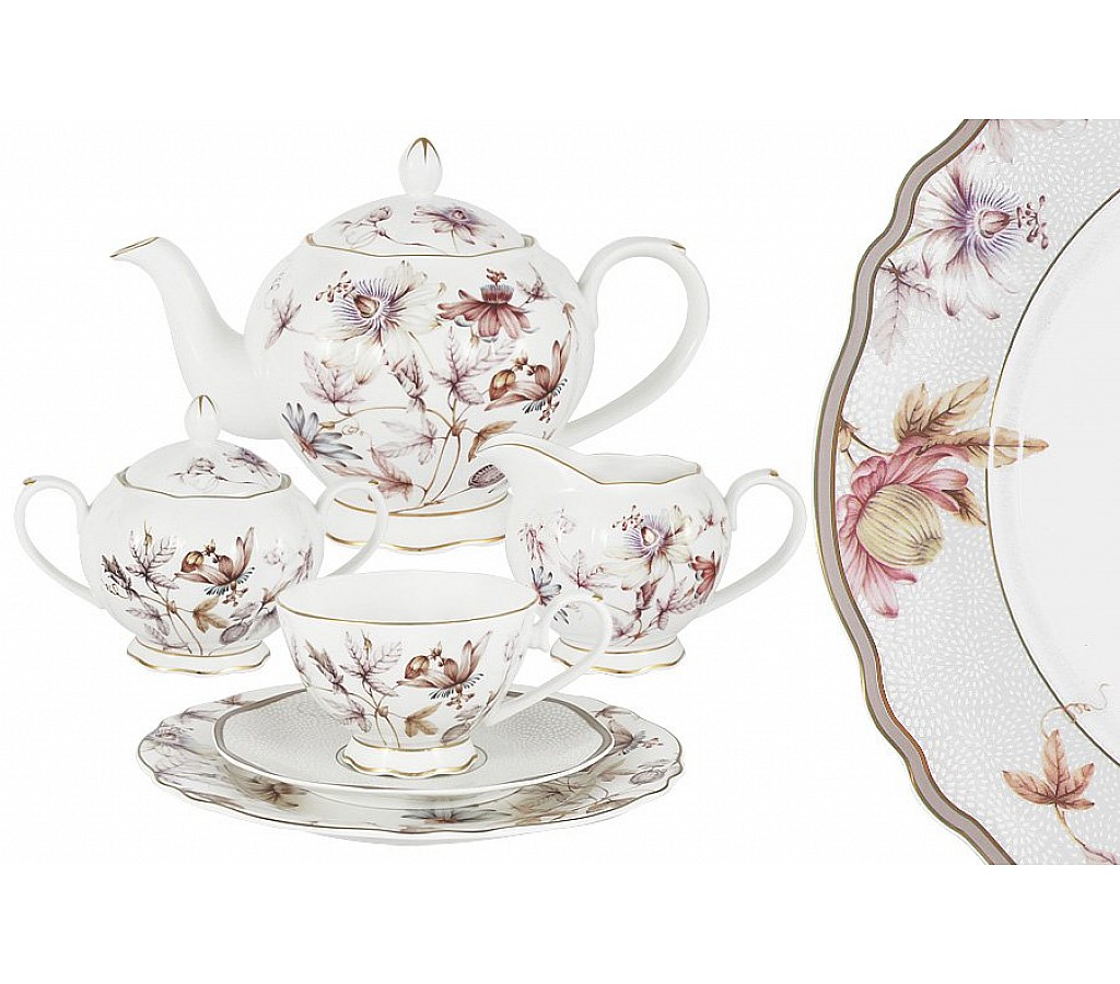 Чайный сервиз Фантазия 21 предмет на 6 персон. Состав сервиза: 6 чашек 0,2л., 6 блюдец, 6 тарелок 20см, чайник 0.8л., сахарница 0,3л., молочник 0,25л. Подарочная упаковка.