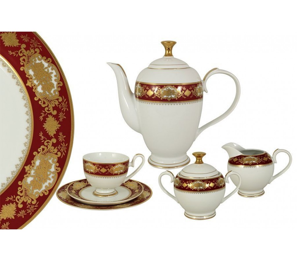 43503 Чайный сервиз Жаклин 23 предмета на 6 персон. Состав сервиза: 6 чашек 0,2л., 6 блюдец, 6 тарелок 19см, чайник с крышкой 1,5л. - 1 шт., сахарница с крышкой 0,35л. - 1 шт., сливочник 0,3л. - 1 шт.