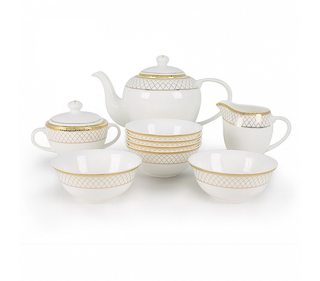 Чайный сервиз казахский с пиалами Искандер состоит из 9 предметов. Он расчитан на 6 персон: Чайник 1250 мл. - 1 шт, Молочник 300 мл. - 1 шт, Сахарница 300 мл. - 1 шт, Пиалы 200 мл. - 6 шт. Рекомендуется мыть вручную и не использовать в микроволновой печи, т.к. в декоре присутствует золото 18 карат (750 проба).
