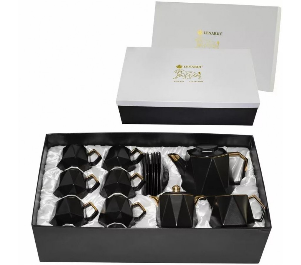 Фарфоровый чайный сервиз Lenardi Грани черного цвета на 6 персон 17 предметов упакован в подарочную коробку. Не рекомендуется использовать в микроволновой печи и мыть в посудомоечной машине, по причине возможного повреждения декоративного золотого покрытия.