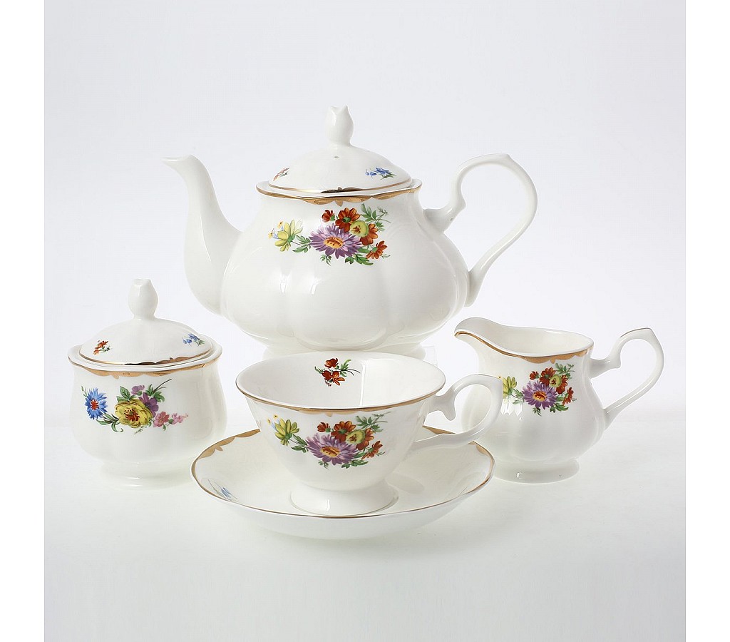 Чайный сервиз Мейсенский букет изготовлен из тонкого китайского фарфора высокого качества. На все предметы нанесен рисунок в виде цветочного букета и тонкая золотая кайма. Сервиз включает в себя все необходимые предметы сервировки: