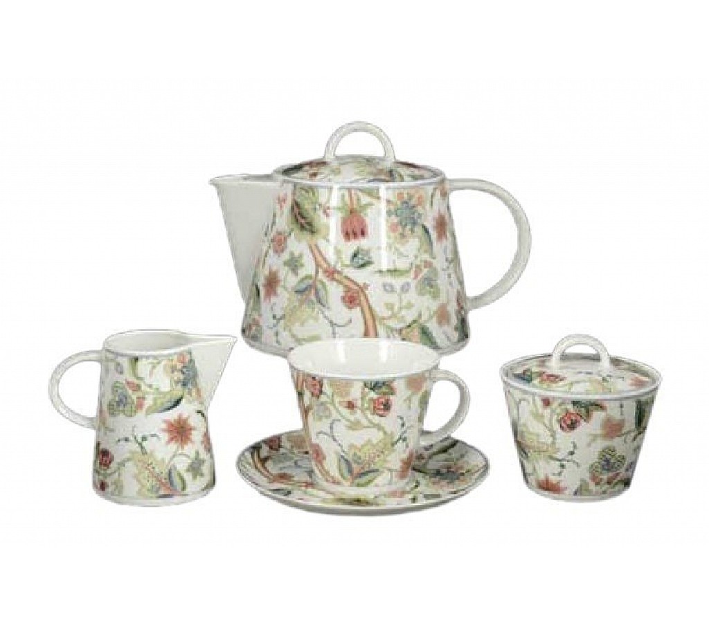 Чайный сервиз серии Том известного чешского бренда Тхун (Thun) изготовлен из высококачественного белоснежного фарфора, устойчивого к сколам и трещинами. Декорирован летним цветочно-растительным рисунком. Сервиз прекрасно подойдёт для ежедневного использования, посуду можно мыть в посудомоечной машине и нагревать в СВЧ.