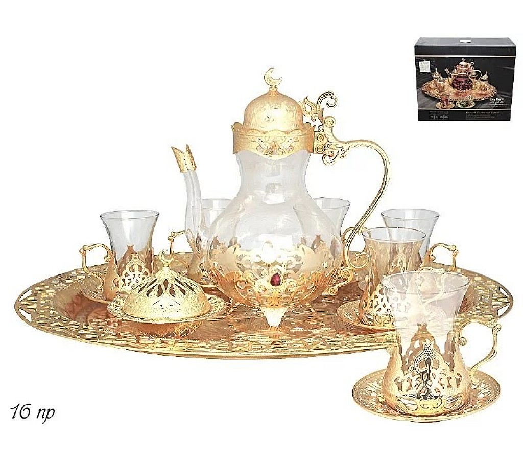 Чайный сервиз на подносе Медь Lenardi на 6 персон 16 предметов. Чайник-кофейник, 6 турецких стаканчиков (армуды) с блюдцами, сахарница. Подарочная коробка. Рекомендуется мыть руками.