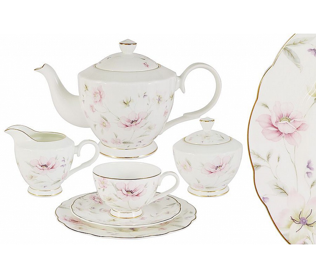 Чайный сервиз Розовый танец 21 предмет на 6 персон 6 чашек 0,25л, 6 блюдец, 6 тарелок 18см, чайник 1,5л, сахарница 0,35л, молочник 0,3