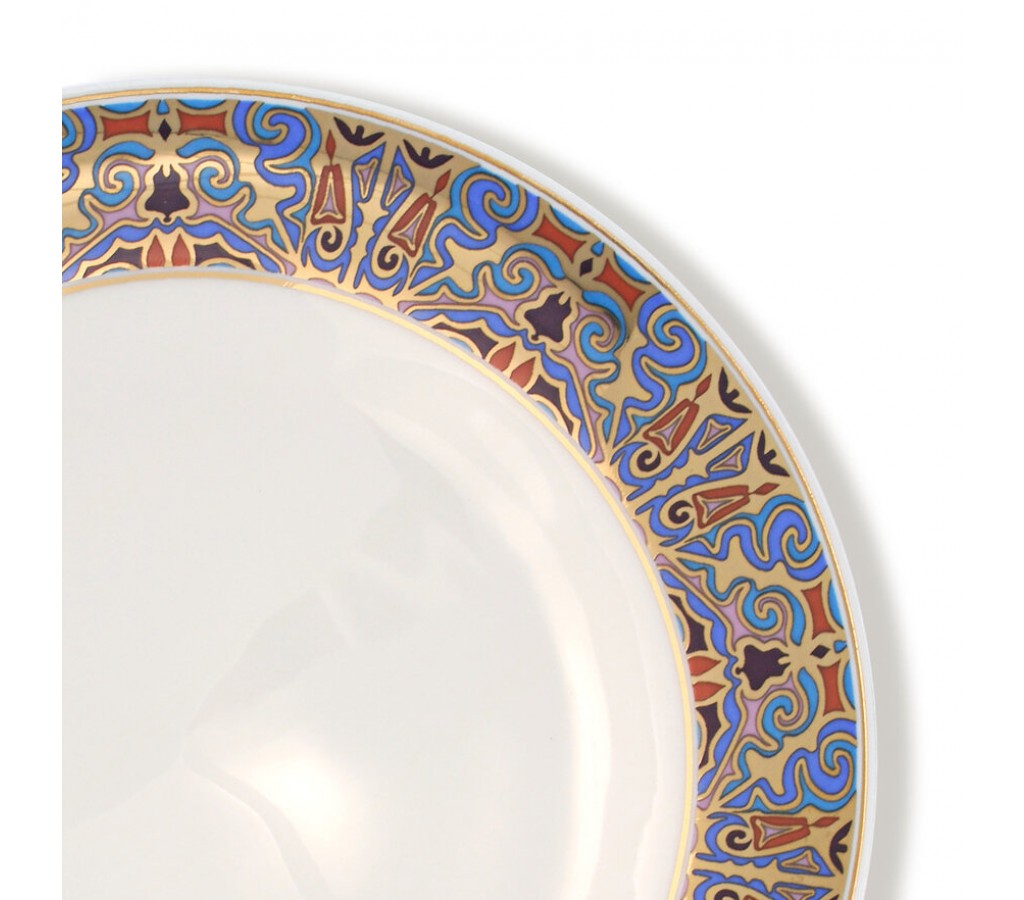 Фарфоровые изделия в чайном сервизе с уникальным переплетением узоров, насыщенной цветовой гаммой, в сочетании с рисунком из настоящего золота произведут незабываемое впечатление на Ваших гостей красотой и изысканностью. Комплектация: Чайник 1600мл. - 1 шт, Молочник 300 мл. - 1 шт, Сахарница 400 мл. - 1 шт, Чашки 250 мл. - 6 шт, Блюдца 15,5 см - 6 шт. Не рекомендуется мыть сервиз в посудомоечной машине и использовать в микроволновой печи.