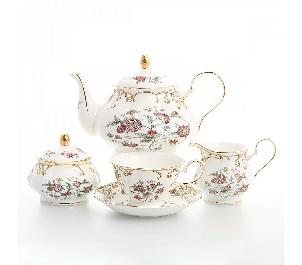 Выдержанный,классический стиль сервиза сразу привлекает внимание, а дополняет неординарность изделия орнамент в виде золотых цветочных узоров. Китайский фарфор всегда ценился своим качеством, легкостью и идеальной белизной, что еще раз подтверждает представленное изделие.