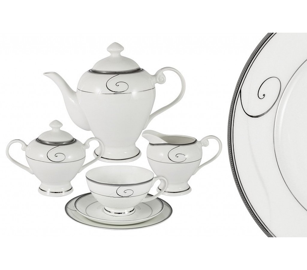 Чайный сервиз Волна 21 предмет на 6 персон: 6 чашек 0.2л , 6 блюдец, 6 тарелок 19см , чайник 1.2л , сахарница 0.35л , молочник 0.35л Подарочная упаковка