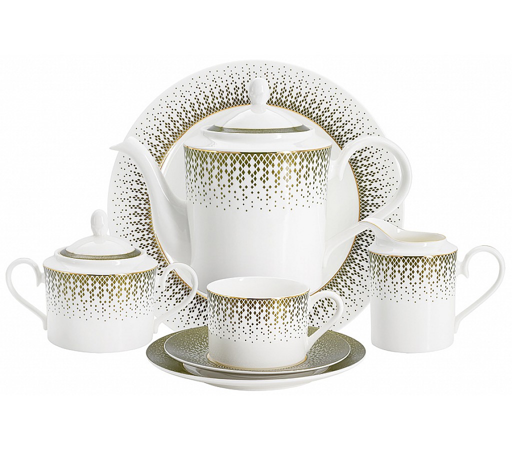 Сервиз чайный, 12 перс, 40 пр, фарфор F, бело-зеленый, с золотистым кантом, матовый, Virtus. Обычная картонная упаковка. Состав: чашка 250 мл - 12 шт, блюдце 15 см - 12 шт, тарелка десертная 18 см - 12 шт, чайник с крышкой 1,35 л - 1 шт, сахарница с крышкой 380 мл - 1 шт, молочник 320 мл - 1шт, блюдо 31,5 см - 1 шт. Не использовать в посудомоечной машине и СВЧ. Мыть тёплой водой мягкими моющими средствами. При длительном контакте с солью, уксусом, томатным соусом, цитрусовыми - элементы декора на посуде могут быть повреждены.