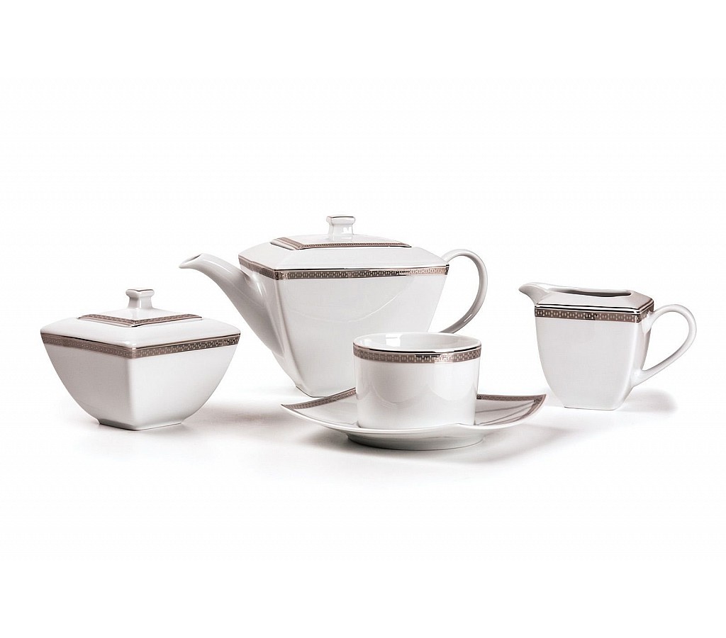 Чайный сервиз Kyoto Saint Germain Platine 1554 Tunisie Porcelaine на 6 персон. Состав: Чайник 1л-1шт.,Сахарница 280 мл-1 шт., Чашка 220мл-6 шт.,Блюдце-6шт.,Молочник 250мл-1шт.