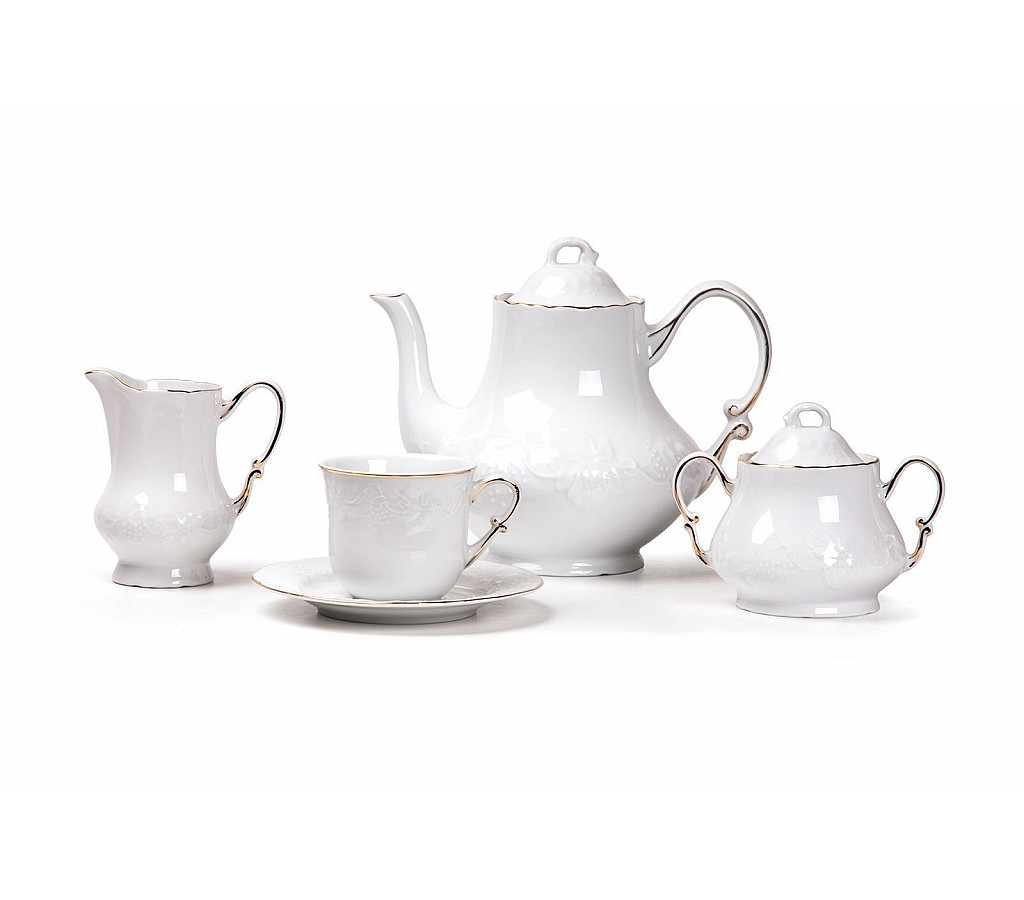 Чайник 1л-1шт.,Сахарница 300 мл-1 шт., Чашка 200мл-6 шт.,Блюдце-6шт.,Молочник 220мл-1шт.