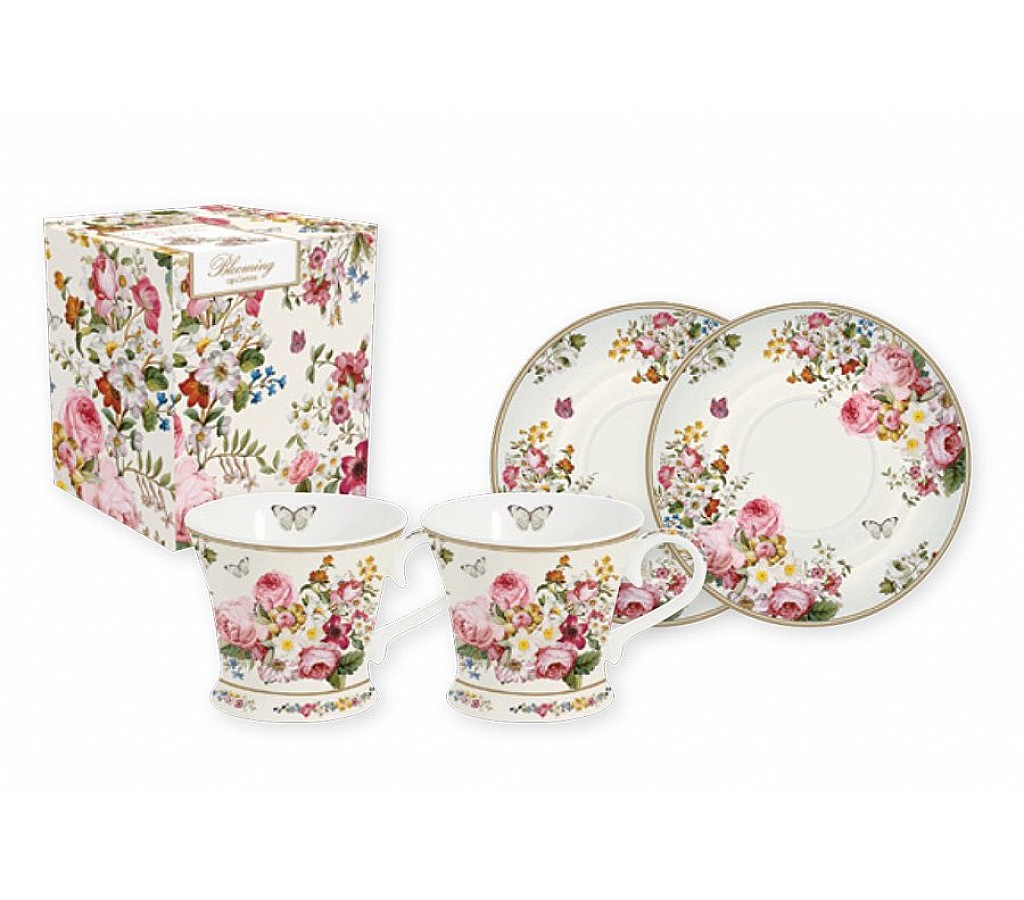 Набор: 2 чашки + 2 блюдца для кофе Цветочный карнавал (белый) 0.08л Подарочная упаковка