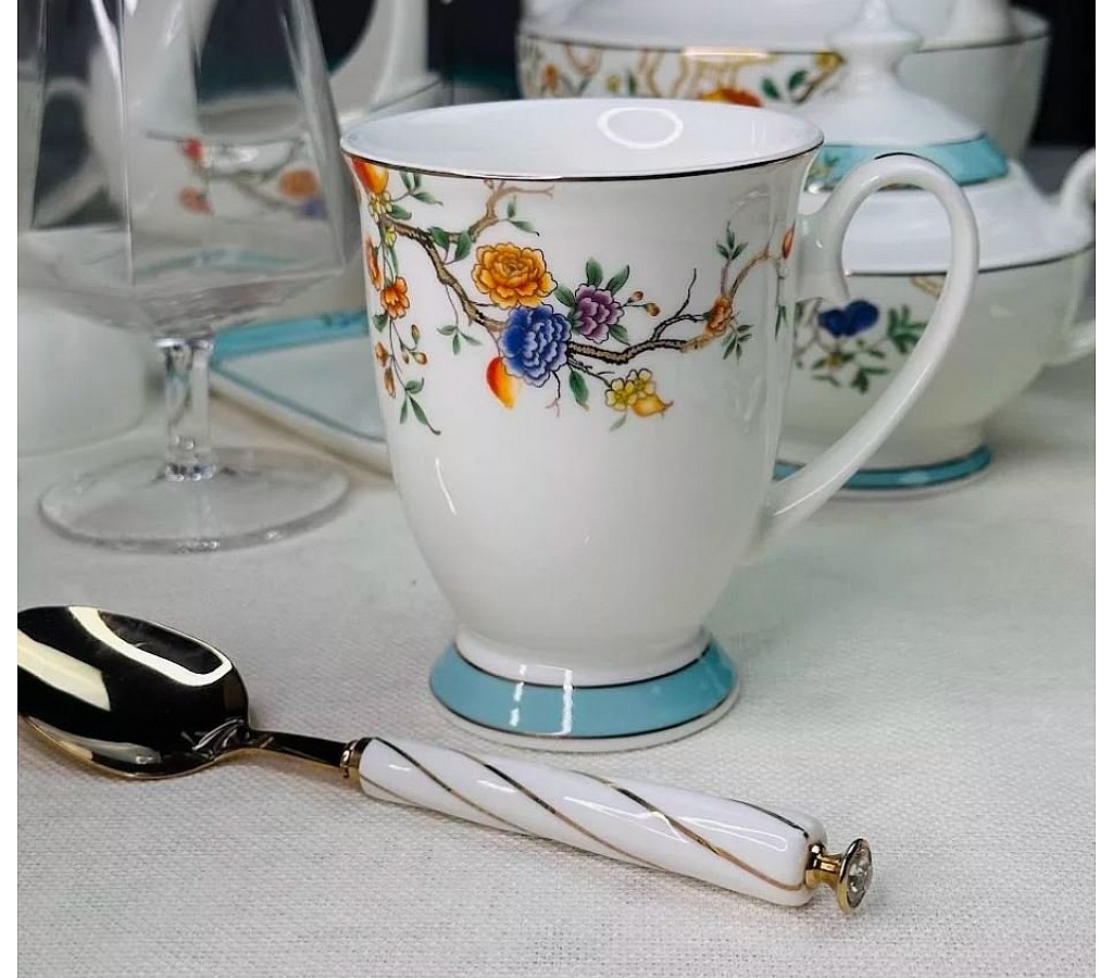 Кружка объемом 350 мл Hanomi изготовлена из тончайшего костяного фарфора.Упакована в подарочную коробку. Не рекомендуется использовать в микроволновой печи и мыть в посудомоечной машине, по причине возможного повреждения декоративного покрытия.