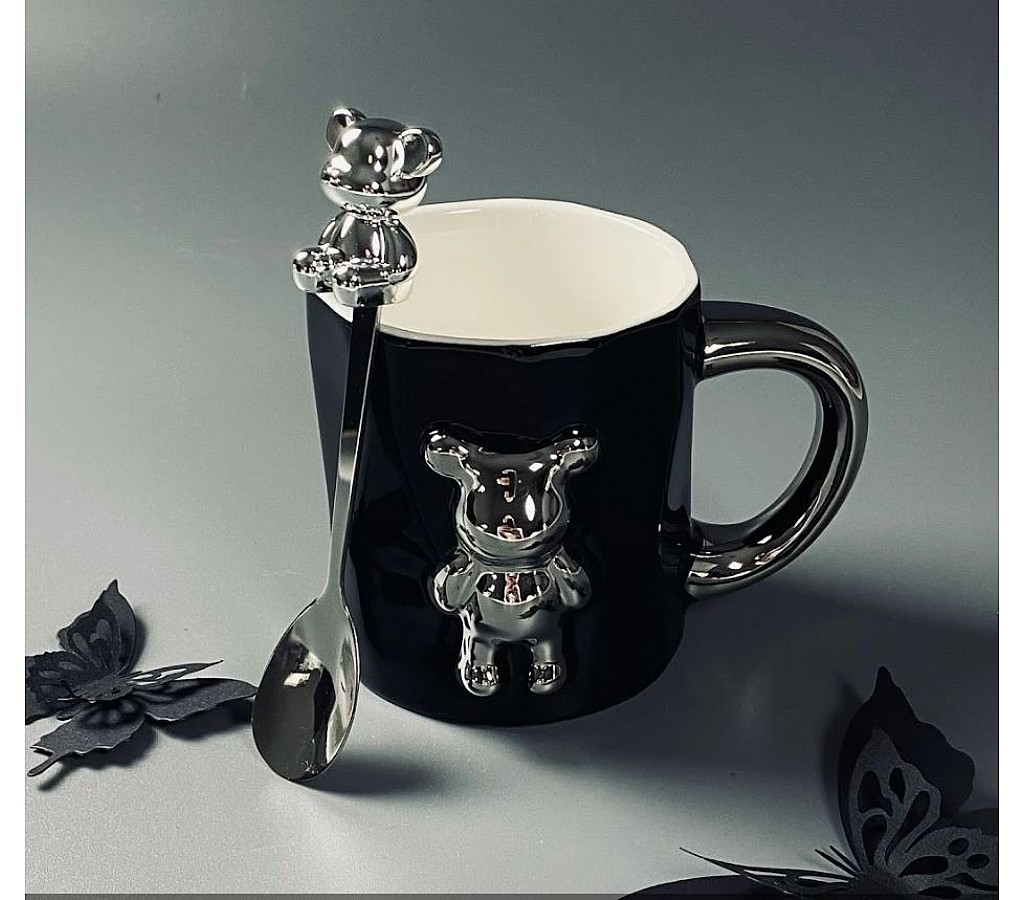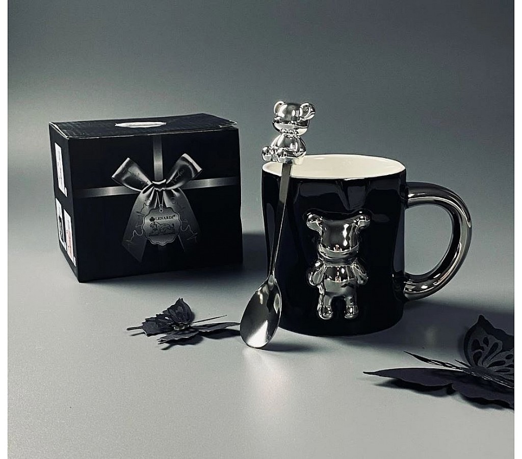 Кружка 350 мл с ложкой Мишки Lenardi черная