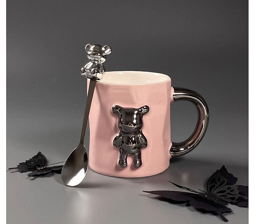 Кружка 350 мл с ложкой Мишки Lenardi розовая