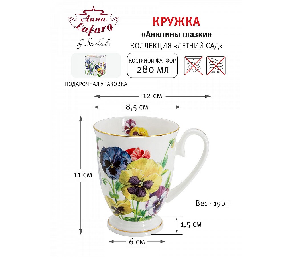 Кружка Анютины глазки, 0,28 л. Мыть тёплой водой с применением жидких моющих средств. Не использовать в СВЧ и в посудомоечной машине