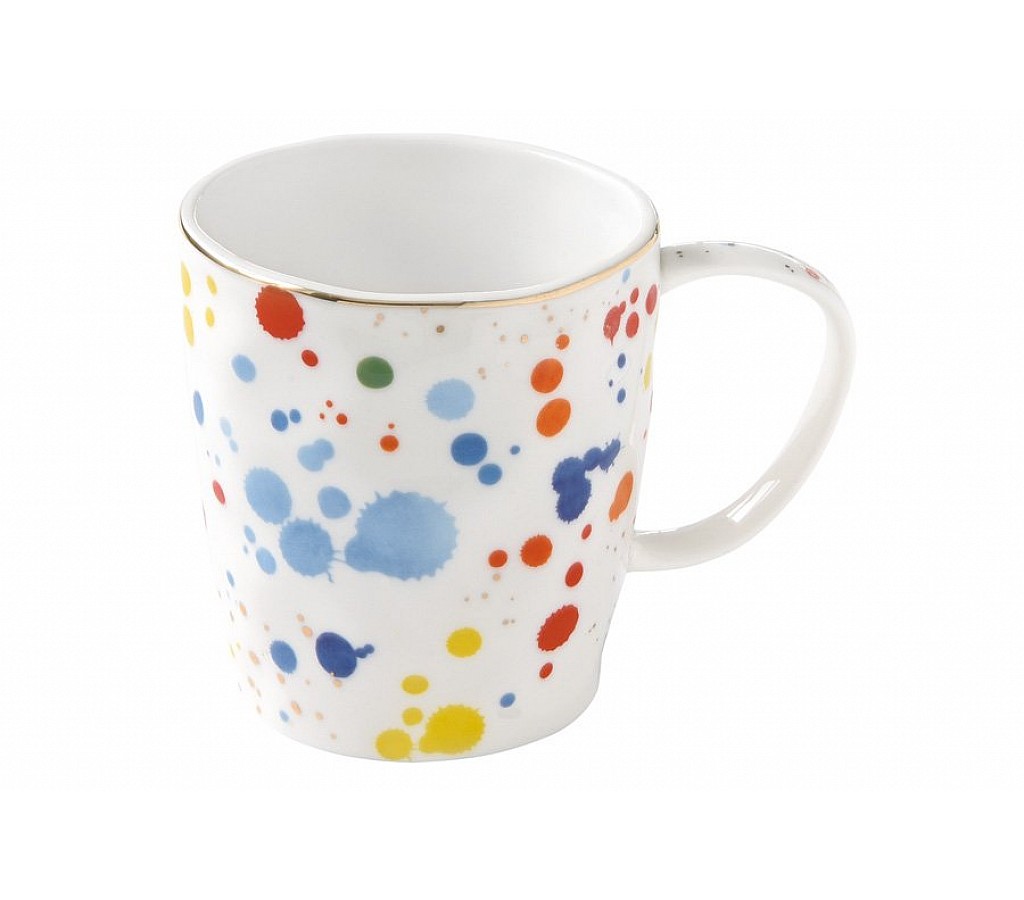 Оригинальный дизайн кружки объемом 350 мл из серии «Брызги красок» придется по вкусу ценителям оригинальных решений. Посуда изготовлена из качественного фарфора белого цвета, и декорирована сочными брызгами красок и изысканным золотым кантом.
