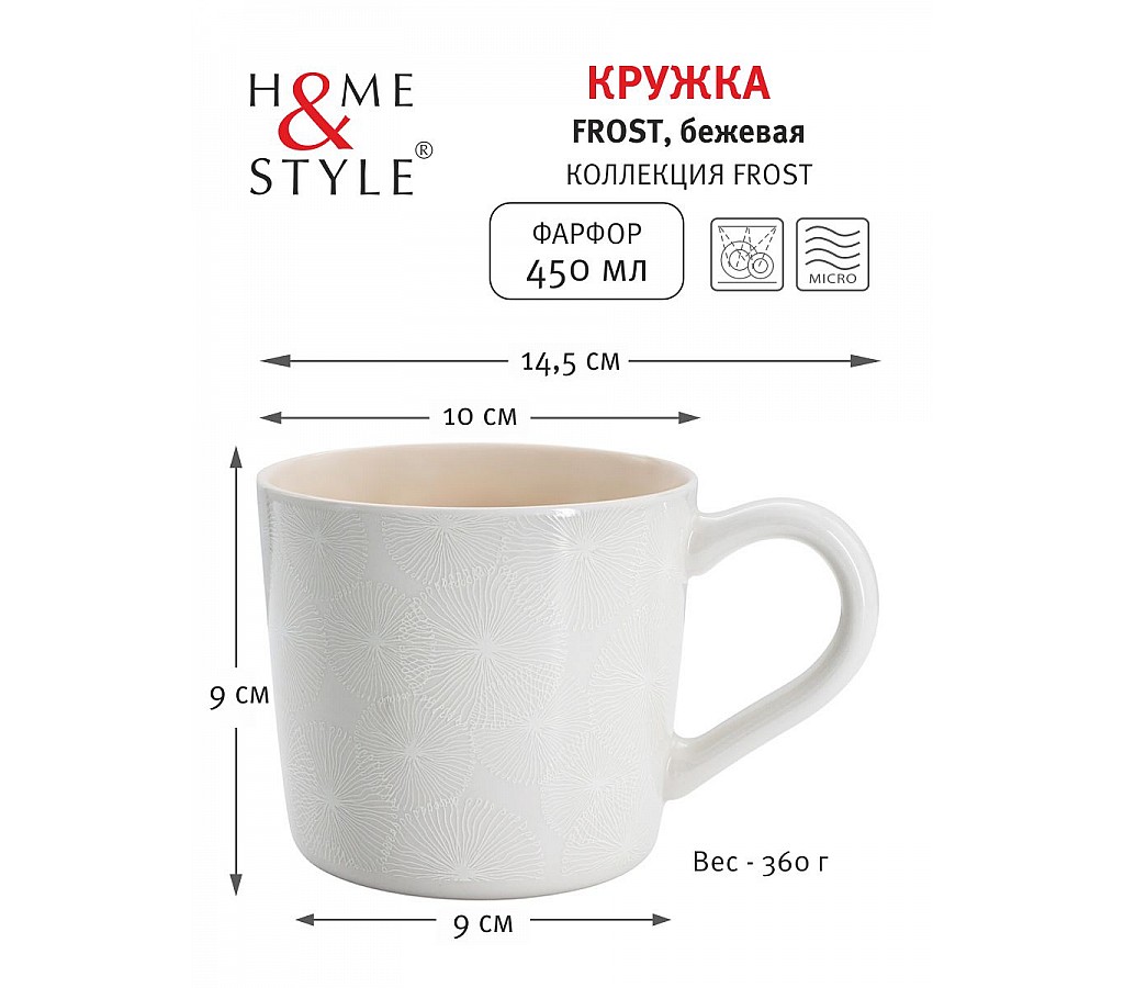 Кружка Frost, бежевая, 0,45 л. Мыть тёплой водой с применением жидких моющих средств. Можно использовать в СВЧ и мыть в посудомоечной машине