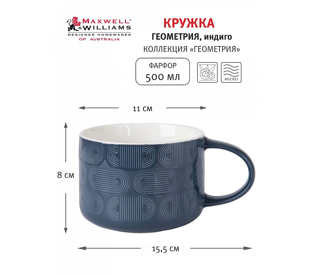 Кружка Maxwell & Williams Геометрия индиго 500 мл. Без упаковки. Мыть тёплой водой с жидким моющим средством. Можно использовать в СВЧ и ПММ.