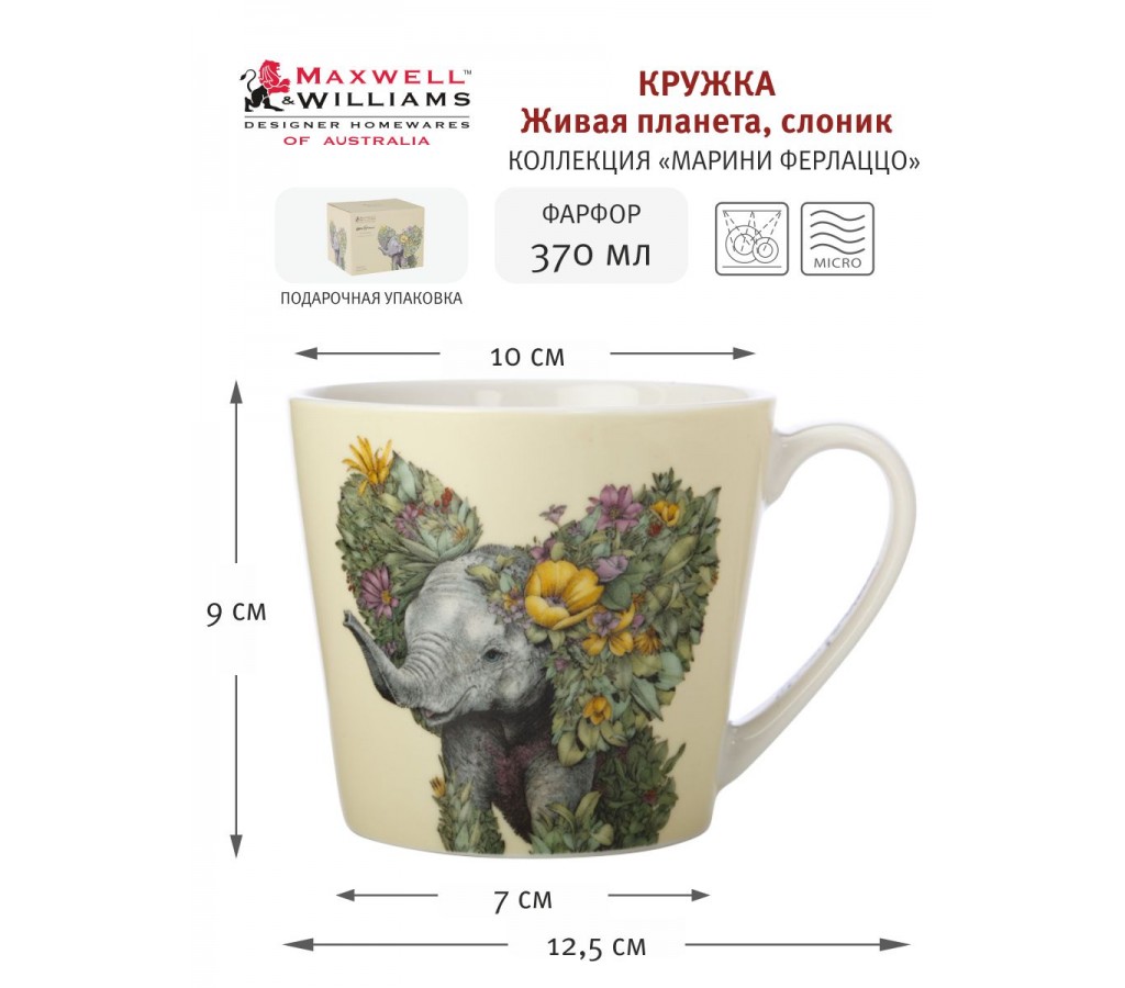 Кружка Живая планета слоник Maxwell & Williams 0,37 литра. Мыть теплой водой с применением жидких моющих средств. Можно использовать в СВЧ и посудомоечной машине. Подарочная коробка.