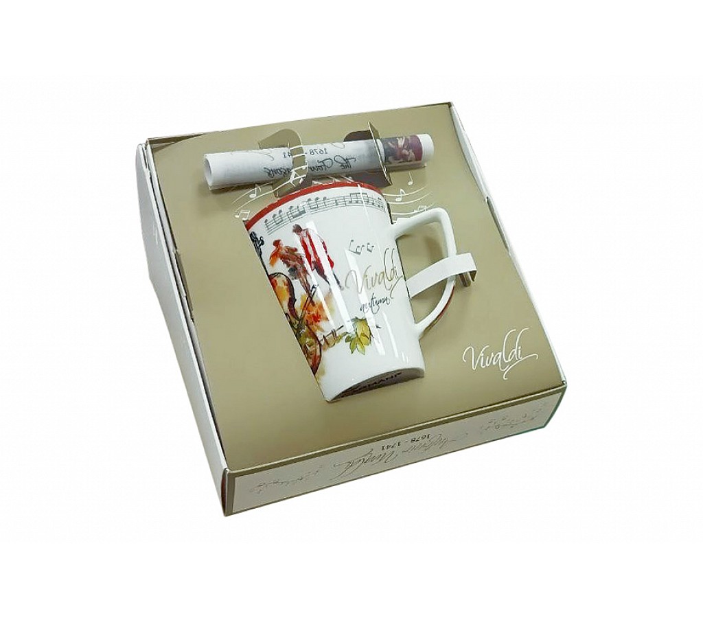 Кружка, 380 мл, фарфор F, белая, с желтым кантом, Лето, A. Vivaldi. Подарочная упаковка. Мыть мягкими моющими средствами. Можно использовать в СВЧ и в посудомоечной машине.