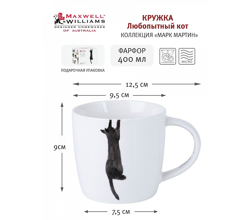 Кружка Любопытный кот Maxwell & Williams 400 мл. Подарочная упаковка. Мыть теплой водой с применением жидких моющих средств. Можно использовать в СВЧ и посудомоечной машине.